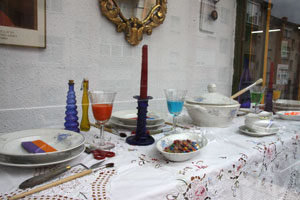 con mantel, platos, vasos, botellas, pinceles, pinturas, espejo, reloj