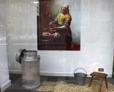 de leche, balde de zinc, banco de madera, paja, Fotografía