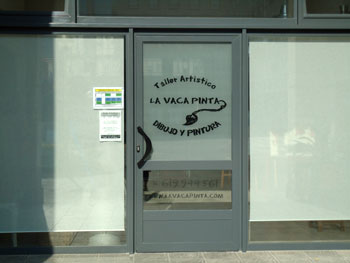 | Cristalera del Taller Artístico La vaca pinta. Exterior. | Puerta de entrada del Taller Artístico La vaca pinta. | |