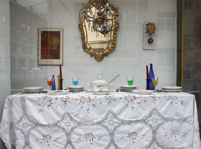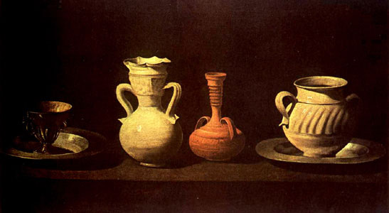 con mantel, platos, vasos, botellas, pinceles, pinturas, espejo, reloj