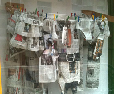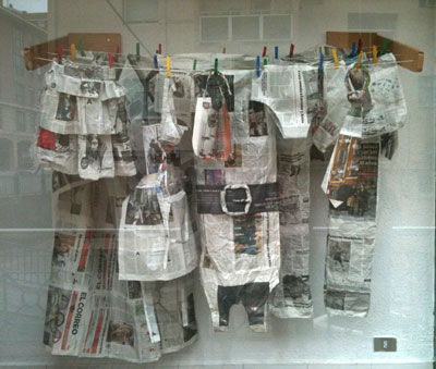 de Ropa: Madera, pinzas de colores, cuerda y papel de periódico.