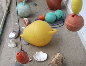 de la playa. Boyas del mar. Cuerdas. Conchas. Piedras. Imágen
